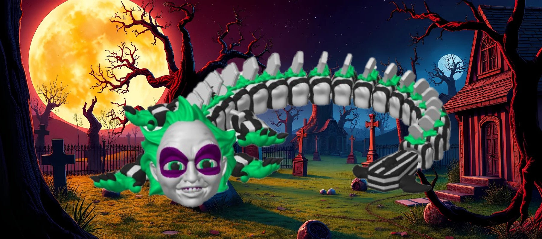 Someone said his name to many times. Came crawling back from the dead, to terrorize you! He is supporting dead eyes on his pale face. Black claws on his green paws. Tombstones run down his back with slime around each one even beetles jumped on. To finish him up, it has a coffin tail with bat wings.